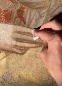Tra questi possiamo indicare: la presenza diffusa di materiale filmogeno superficiale di restauro, estraneo all’originale e la presenza di pigmenti particolari che si possono impiegare solo con tecnica a tempera come, ad esempio, il giallo di piombo e stagno, o a secco, come il blu azzurrite, il verde malachite e il cinabro.